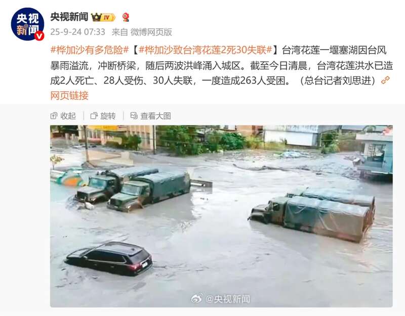 据央视新闻客户端,总台记者获悉,截至24日清晨,台湾花莲县洪水已造成2人死亡、28人受伤、30人失联,一度造成263人受困。洪水还导致当地4300多户停水,2600多户停电。此前一天,台湾花莲县马太鞍溪上游堰塞湖因台风暴雨溢流,冲断马太鞍溪桥,随后两波洪峰涌入城区。