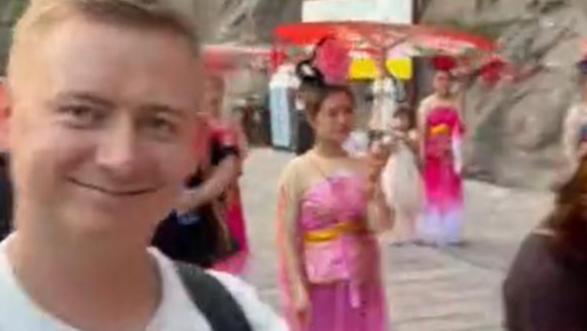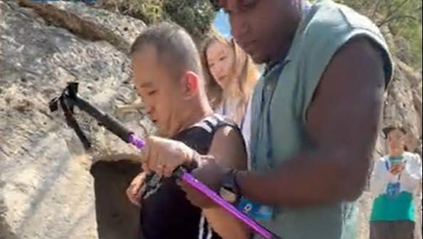 Colombian tourist helped person with disabilities go down at Xiangtang Mountain中国青年报客户端2025-09-12 11:45:12