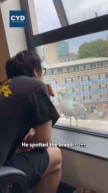A sneaky seagull parked itself outside a window while he was eating bread中国青年报客户端2025-08-09 21:01:59